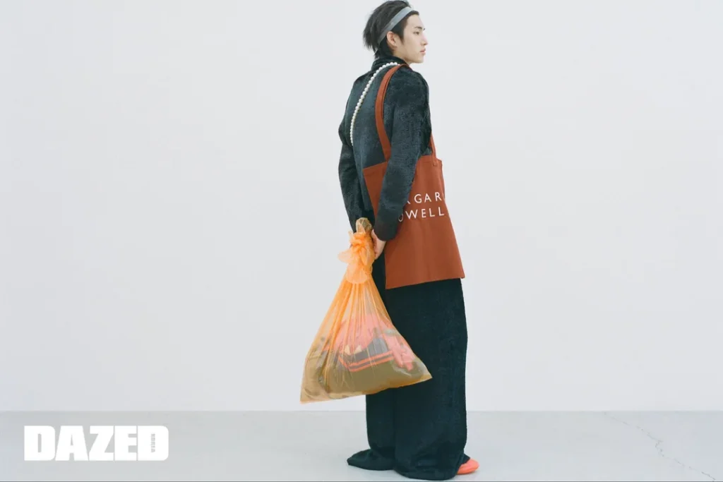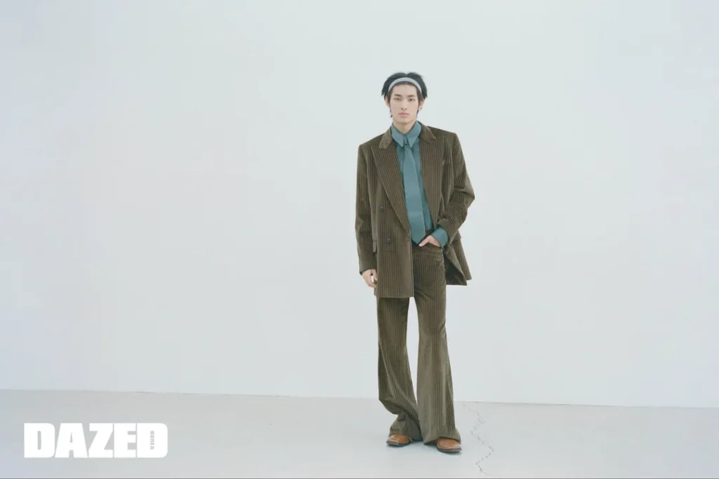 The atmosphere leans into DAZED’s signature clash of street and high-fashion—clean studio shots and muted winter palettes, but styled to feel like captured moments rather than idol promotion stills. This lets his youthfulness stay intact while his proportions and posture are framed like a runway model’s, signaling his potential as a recurring editorial face beyond group schedules.