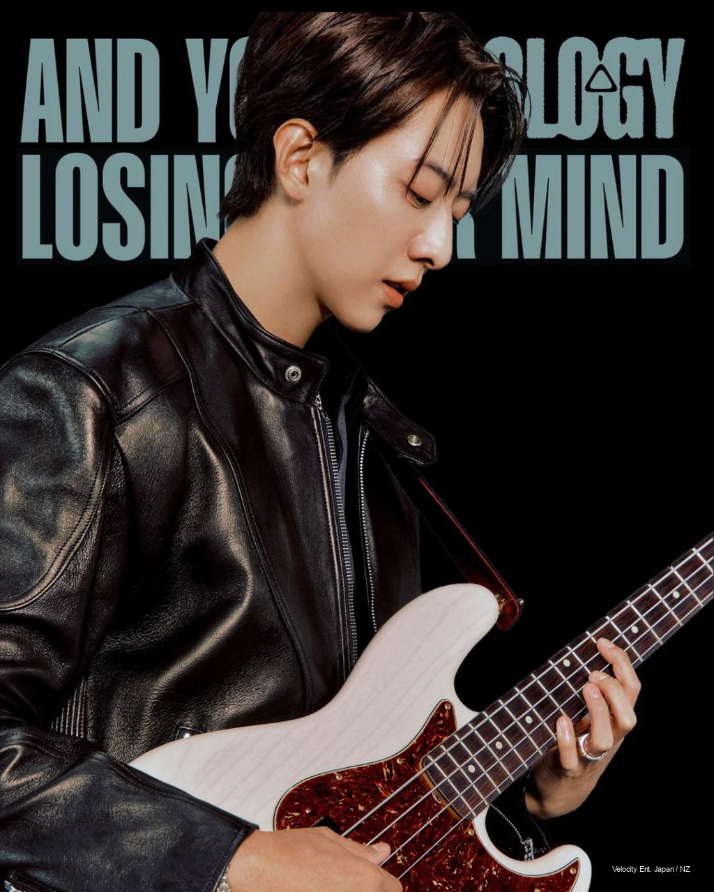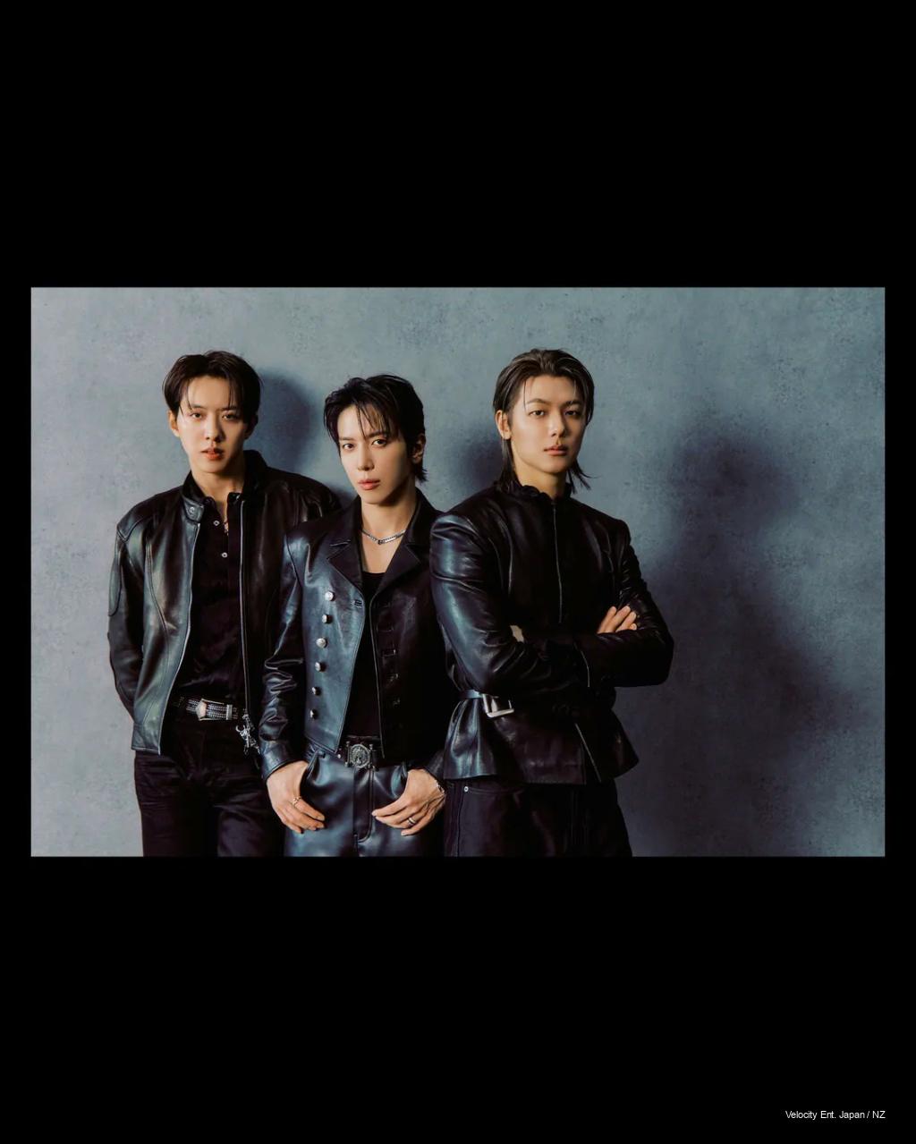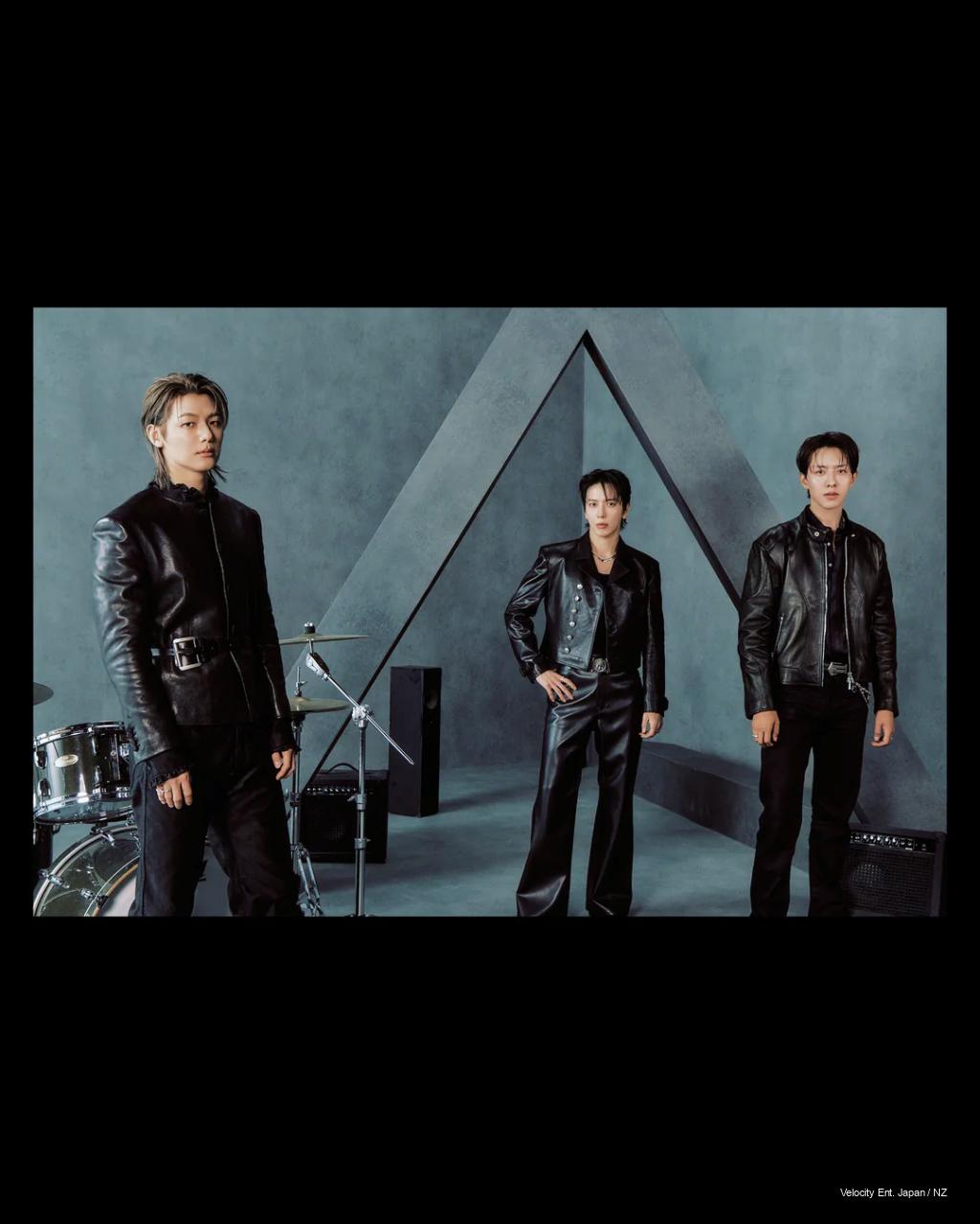 • The first group concept photo is laid out like a bold festival or tour poster, with the members in leather jackets standing in front of their instruments, their gazes direct and unapologetically “rock star.”