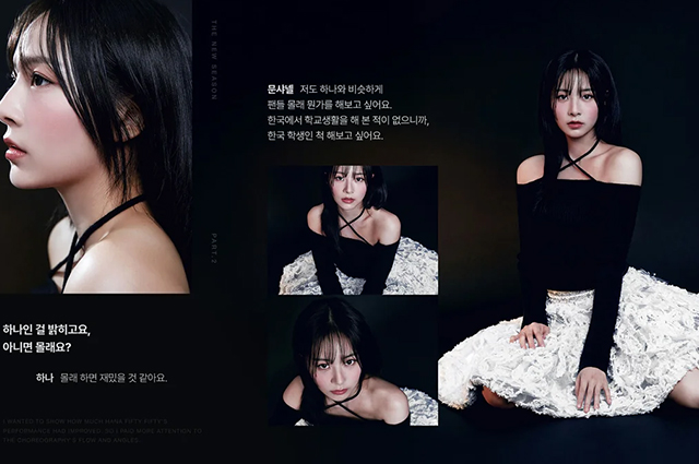 The editorial styling for this shoot channels a chic, modern vibe with an emphasis on clean lines, minimalist yet impactful silhouettes, and a color palette that feels both fresh and timeless. Each member of FIFTY FIFTY presents a distinctive look that harmonizes with the cohesive mood of the spread, transforming the group’s youthful energy into a mature fashion statement.