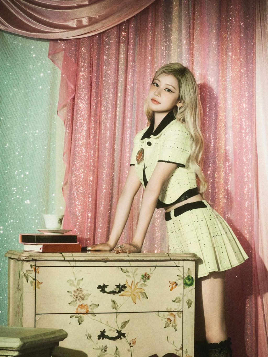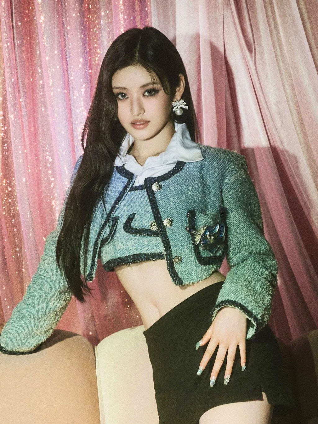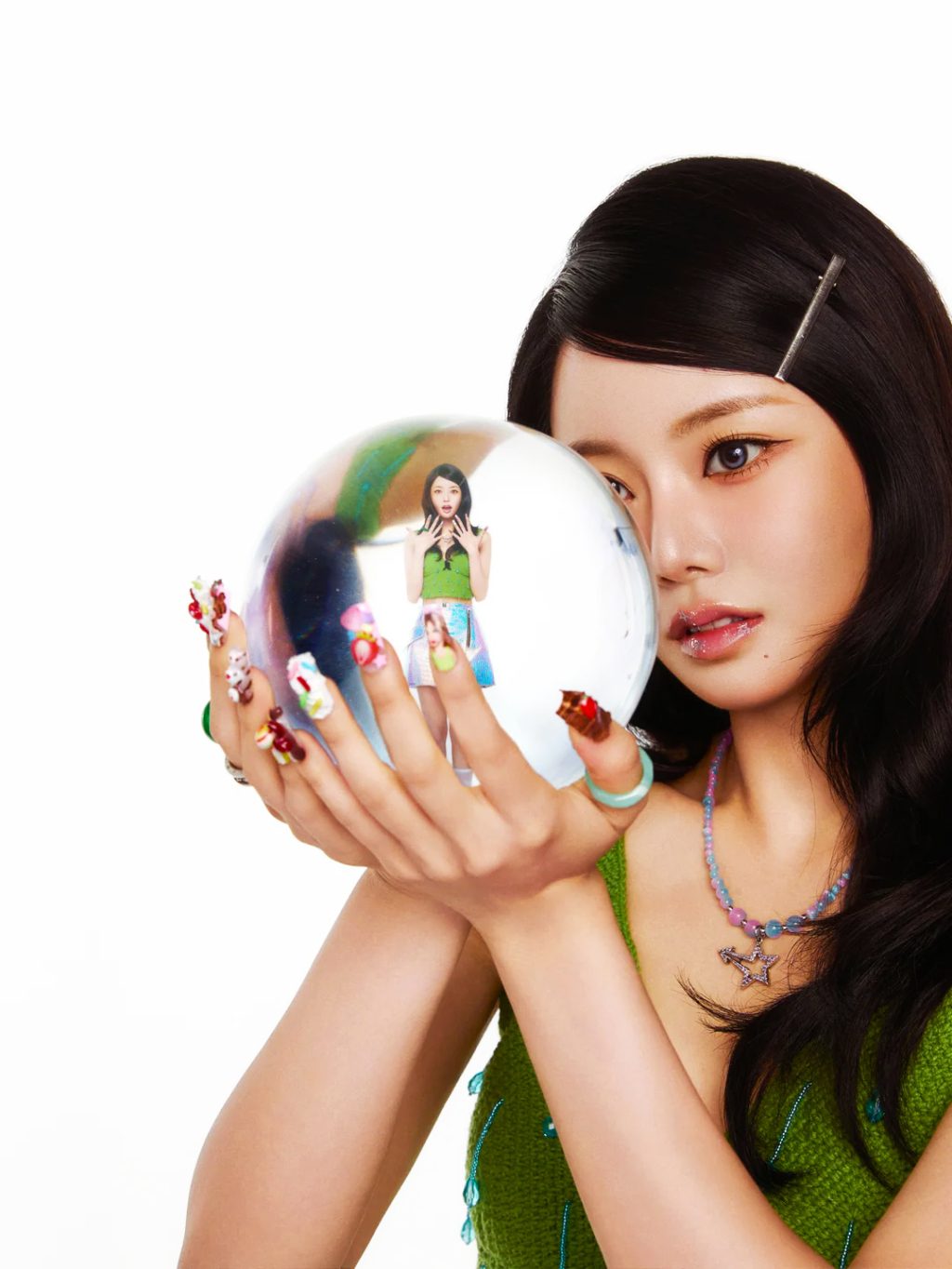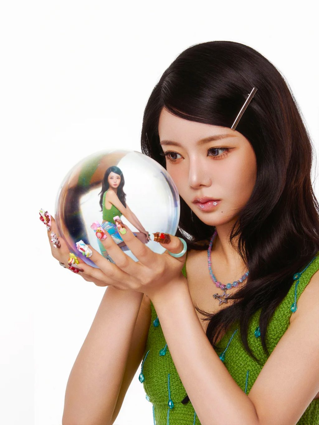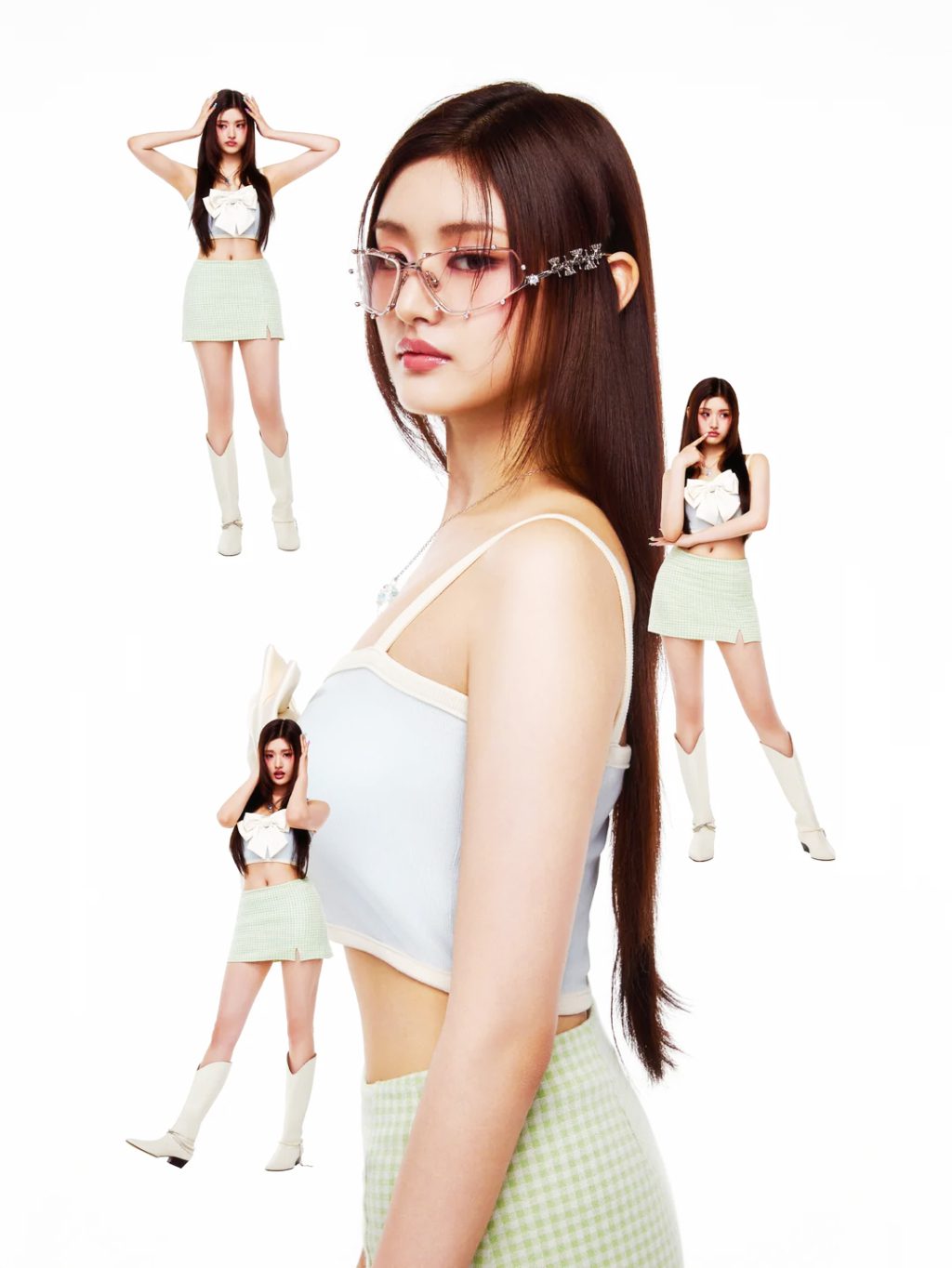 The styling direction relies on a curated mix of sharp tailoring and theatrical details—glasses with Bayonetta-style drama, chic blazers, and polished accessories are all present to add layers of depth to the visual story. Makeup complements the theme perfectly with a mix of natural doll-like beauty and bold touches, including meticulously applied freckles and a soft yet impactful glow that enhances each member’s unique charm while maintaining an ethereal, goddess-like presence.