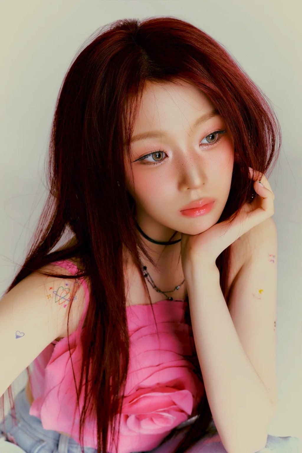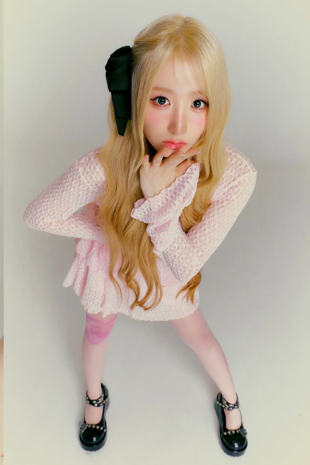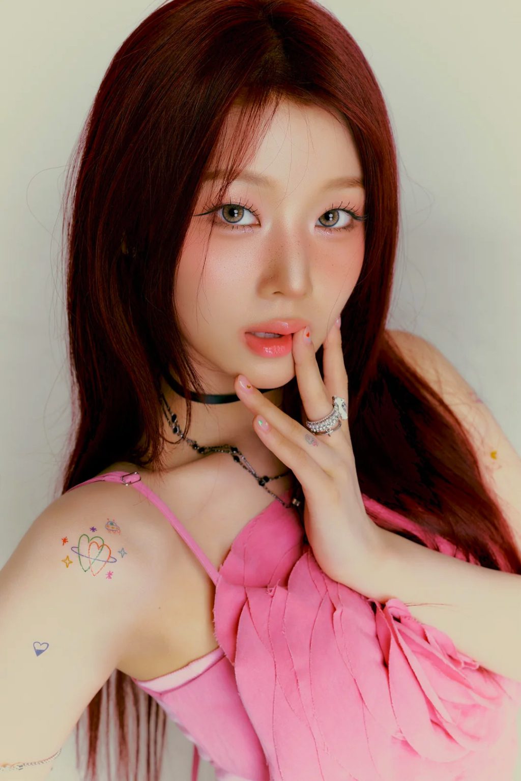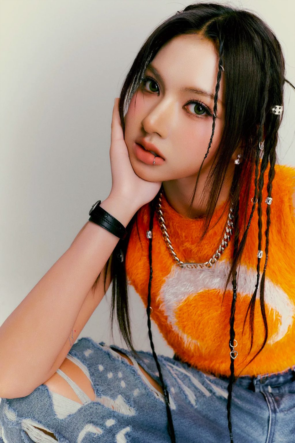 - Mei delivers a punchy look featuring neon accents and graphic prints, embodying the energetic pulse of the EP. Her eye makeup pops with dynamic liner shapes and shimmering highlights, complemented by sleek, straight hair parted sharply for a futuristic charge.