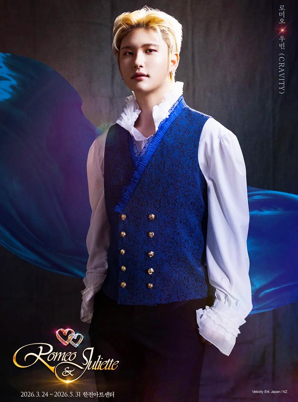Woobin (CRAVITY) captivates with his main vocal versatility in ballads and pop. Producers praise his “refreshing voice” for a youthful, fated Romeo.
