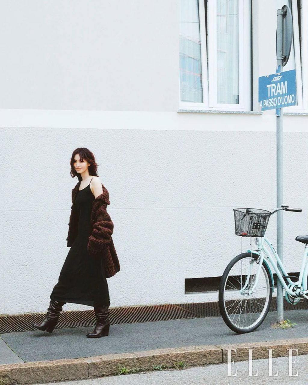In terms of styling, Momo’s wardrobe blends high-impact sporty pieces like faux fur-trimmed clogs and sleek pumps with minimalist knitwear and tailored dresses, emphasizing both comfort and elegance. The overall look conveys versatility suited for diverse urban occasions—from daywear to formal settings.