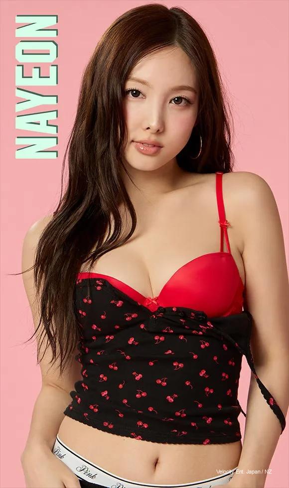 - Nayeon: Soft pink lingerie set under a matching cardigan; loose waves cascade, nude lips plump with glossy shine, winged liner for bunny-eyed mischief.