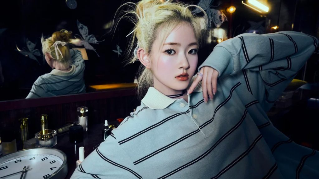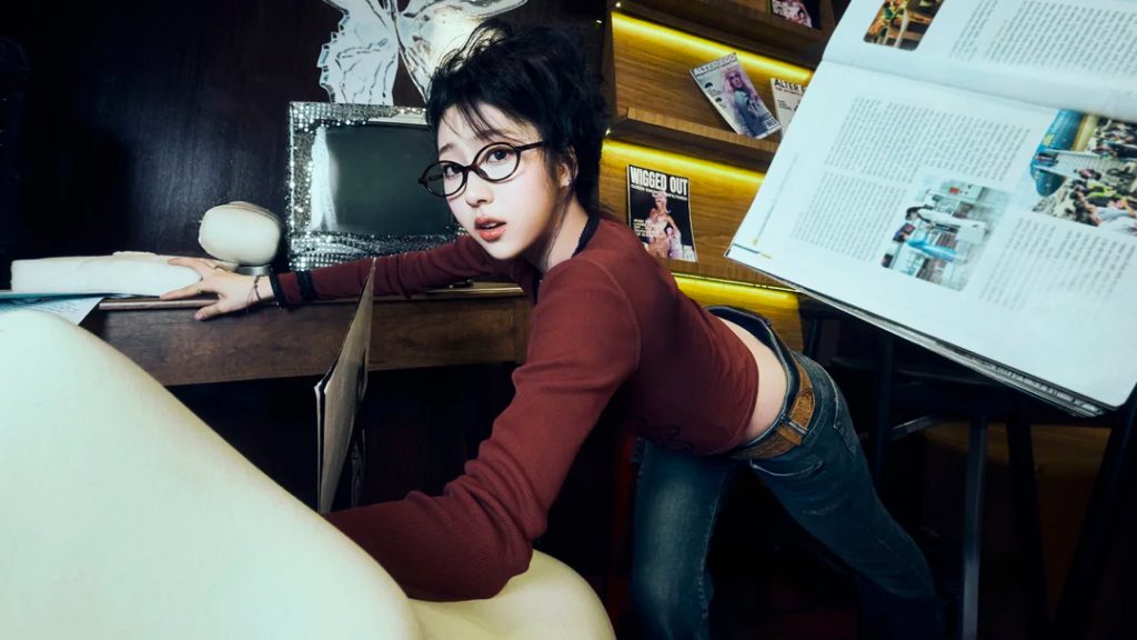 - Jiyun rounds out the group with a grounded yet striking look—slicked-back hair paired with a bold red lip and sharp contouring that projects confidence and power.