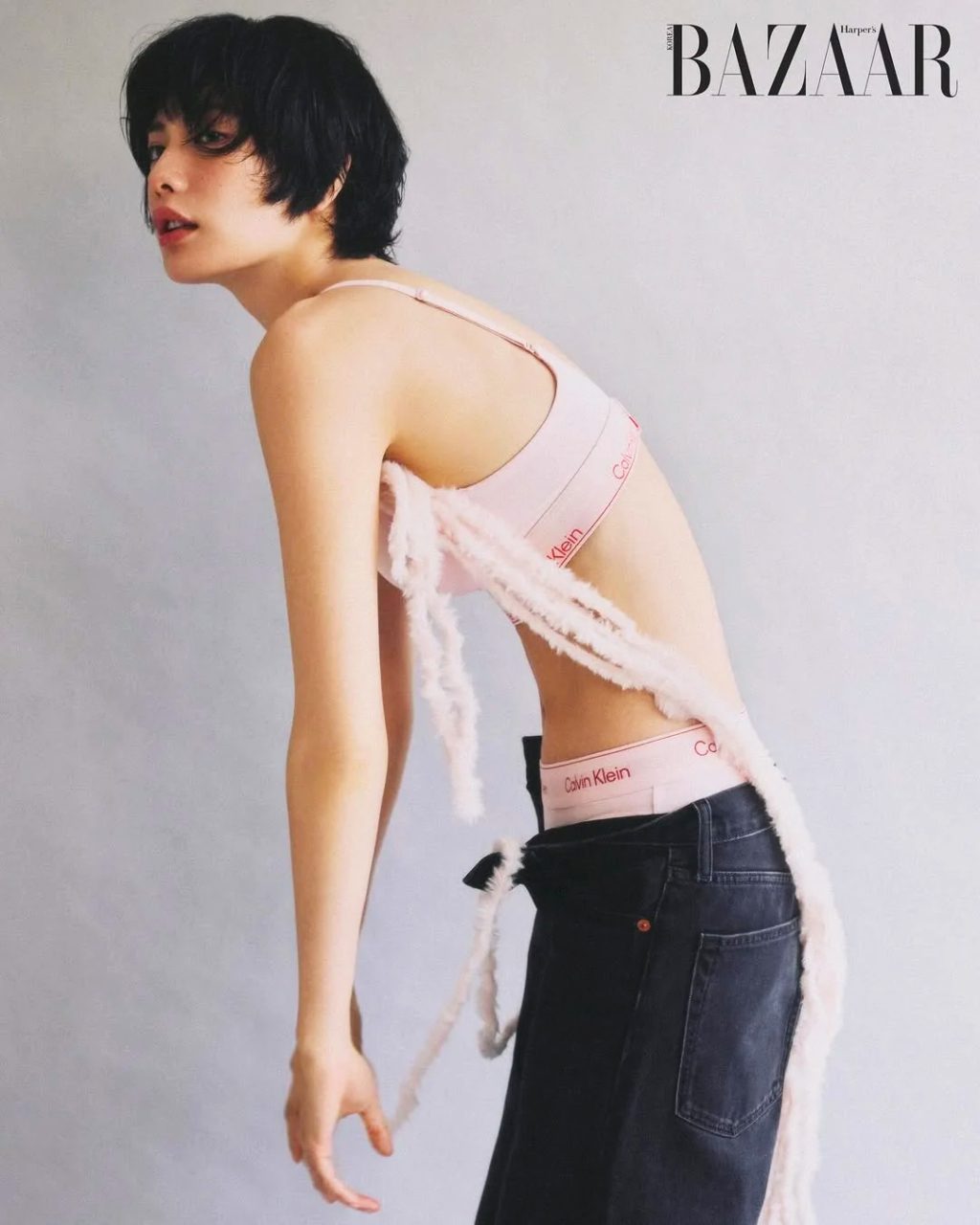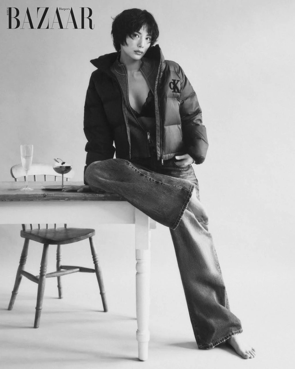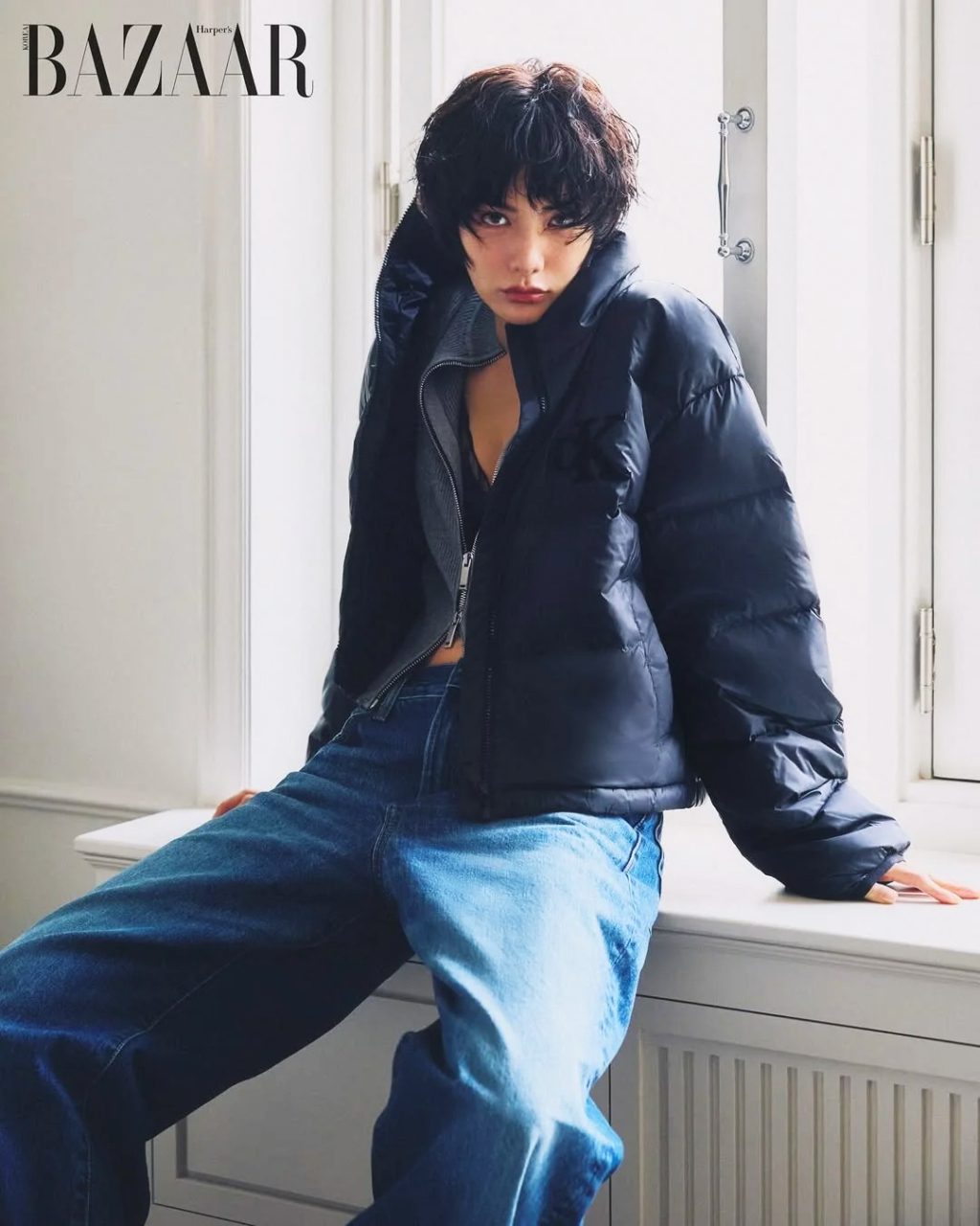 This pictorial extends Nana’s 2025 Calvin Klein narrative, where she has been fronting the brand in emblem‑print denim, baseball jackets, and straight‑leg jeans that channel an unfussy, urban cool. In the BAZAAR collaboration, that vocabulary sharpens: minimalist silhouettes, linear logo patterns, and sculpted outerwear anchor each look, with fabric weight and cut doing the talking instead of overt ornament. The clothes are engineered to sit just off the body—relaxed but intentional—reading as if Nana has slipped into a perfectly edited winter capsule pulled straight from a downtown loft.
