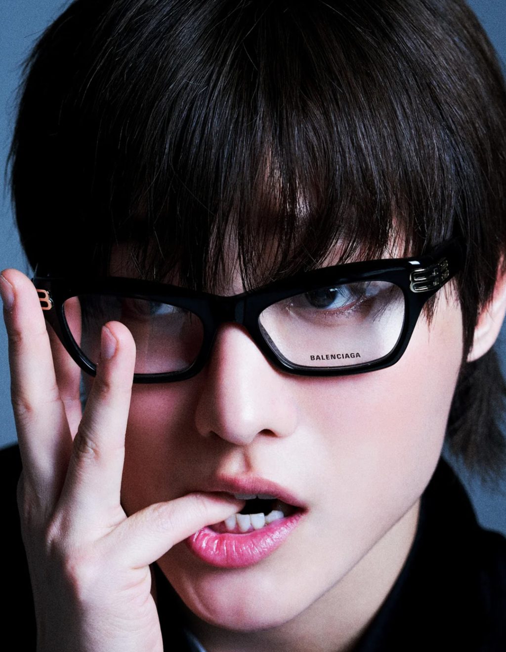 Diving into the pictorials, the editorial explores a series of visual contrasts that play with light, shadow, and texture. One look presents WOODZ draped in an avant-garde ivory silk shirt paired with sculptural black trousers. The juxtaposition between fluid fabric and strong tailoring creates a dynamic tension, symbolizing his duality as an artist—soft yet commanding. His hair in this sequence is styled with slightly heavier volume and a natural wave, introducing an organic feel that balances the editorial’s architectural silhouettes. The makeup here leans into a dewy finish, with a hint of soft smoky eyeshadow to add depth and enigmatic allure.
