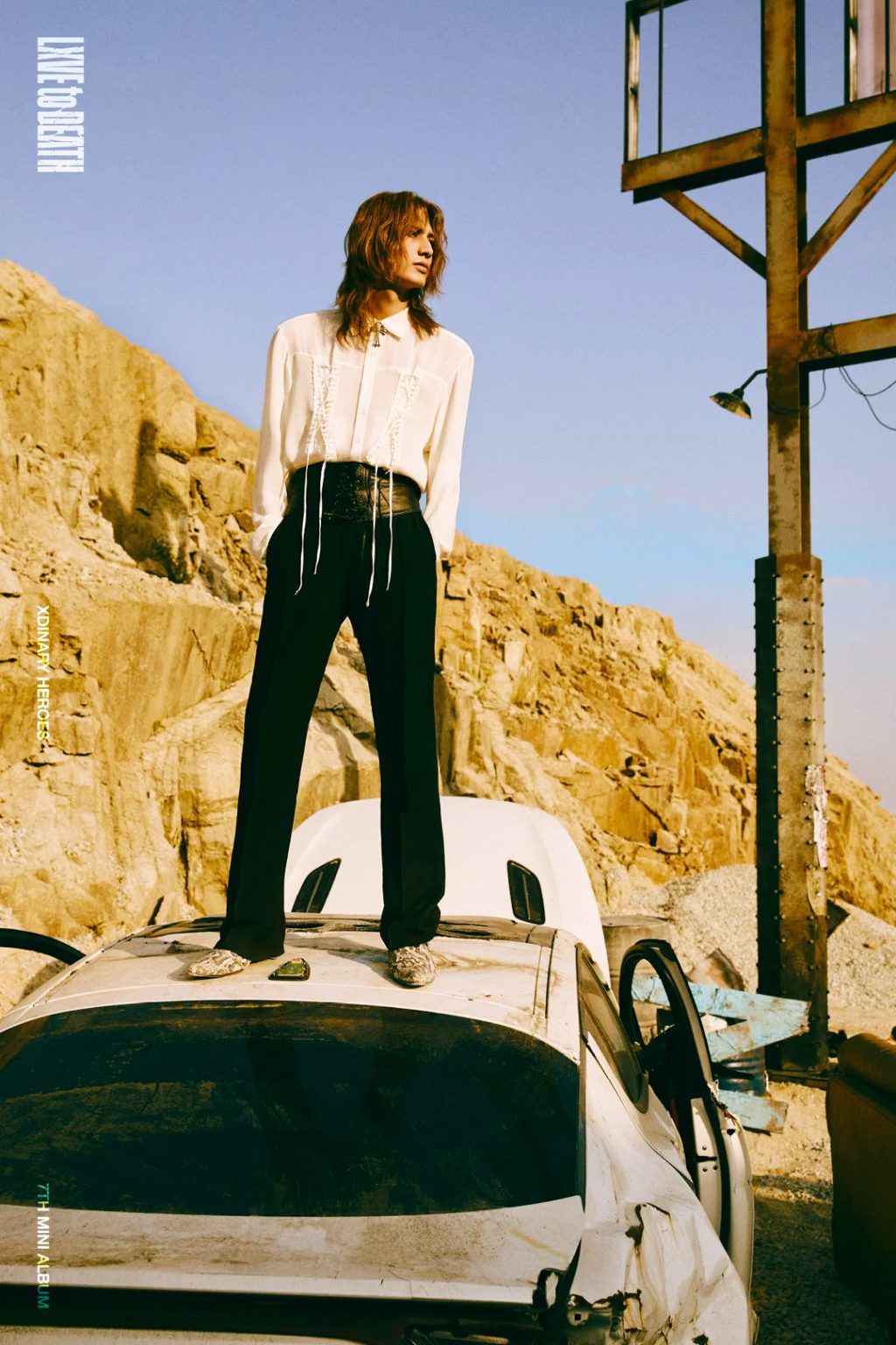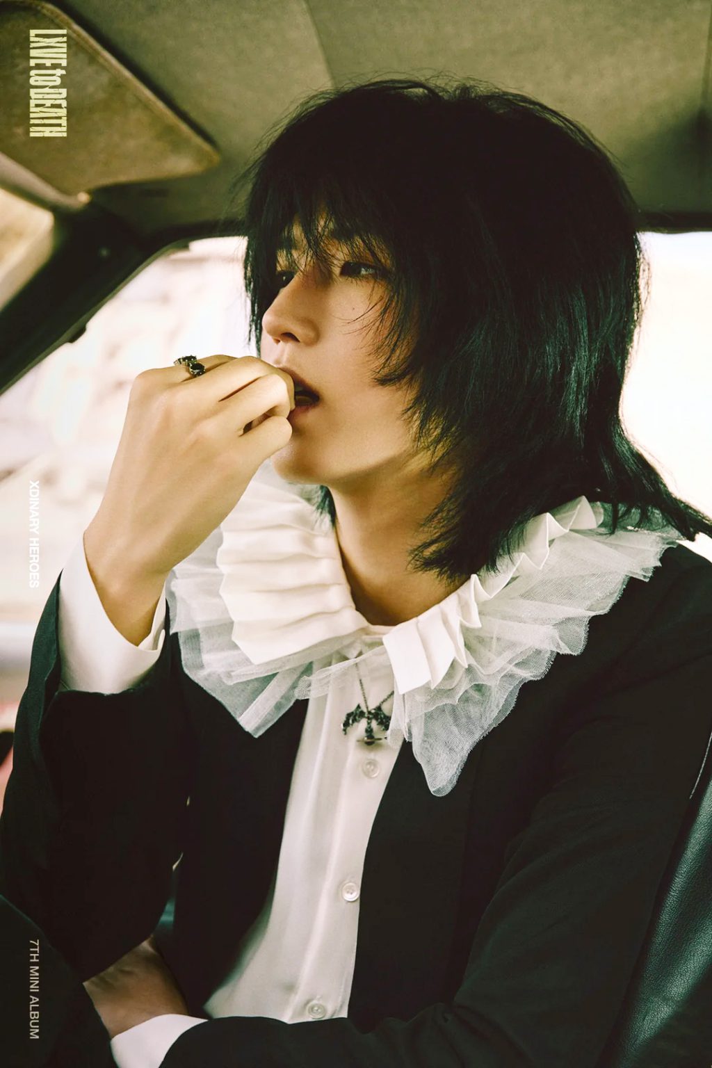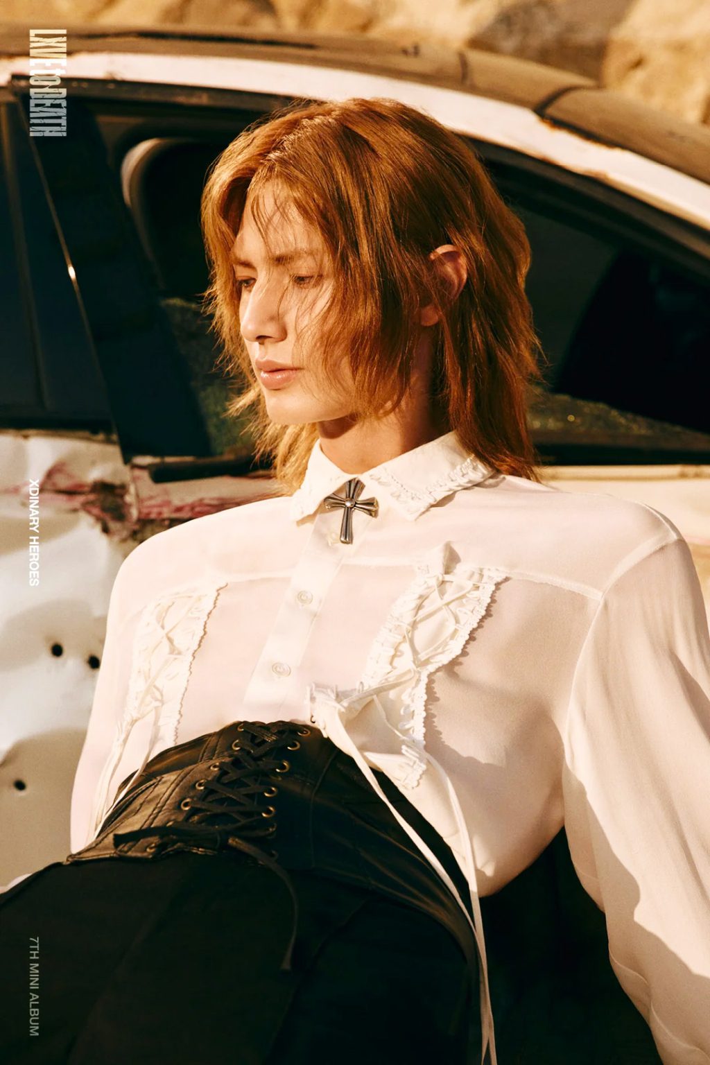 Xdinary Heroes’ 7th mini album “LXVE to DEATH,” dropping October 24, embraces a striking duality captured vividly in the latest concept photos of members Jooyeon and Jun Han. Moving away from the earlier wild and chaotic imagery, these new visuals present a remarkable transformation marked by elegance and emotional depth. Jooyeon dazzles in crisp, soft silks and frills inspired by European Renaissance fashion, creating an intriguing contrast against the gritty backdrop of a car junkyard. His melancholic gaze brings an autumnal, introspective vibe that complements the delicate textures of his attire.